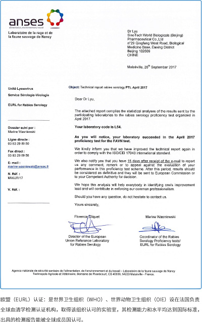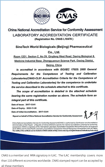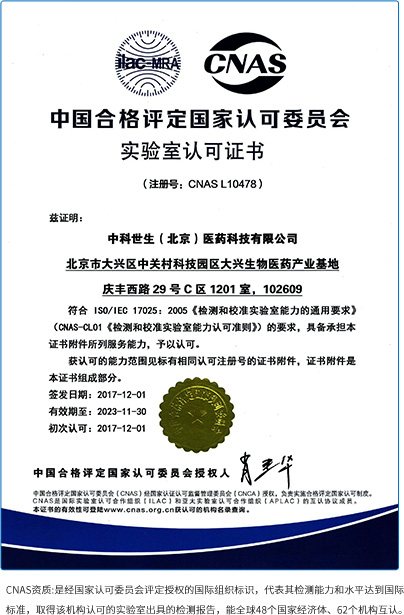 中科世生建有完善的與國際接軌的質量管控體系。2017年5月獲北京市質量技術監督局CMA認證授權、9月獲歐盟(EURM)實驗能力認可、12月獲中國合格評定國家認可委員會CNAS認證,這是目前國內在病毒檢測、滅活、去除工藝驗證領域獲得“三認證”授權的專業技術服務企業。2018年中科世生為用戶提交的英文版檢測報告已被美國FDA認可并取得注冊證書。
