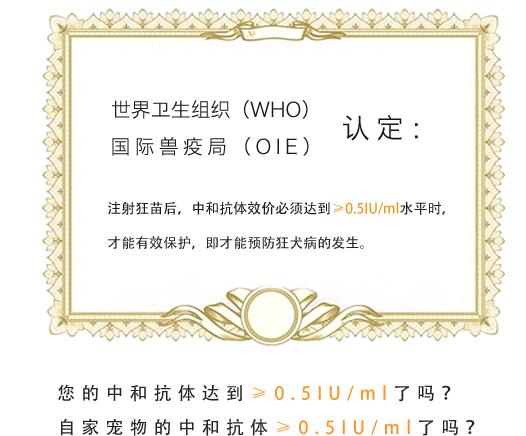 目前市場上用的檢測手段是金標試紙或ELIS方法,這兩種方法均測不出中和抗體的具體數值是否≥0.5IU/ml,所以只有采用世界衛生組織(WHO)、國際獸疫局(OIE)和中國藥典推薦的FAVN或RFFIT這兩種方法,才能測出中和抗體的具體數值是否≥0.5IU/ml。